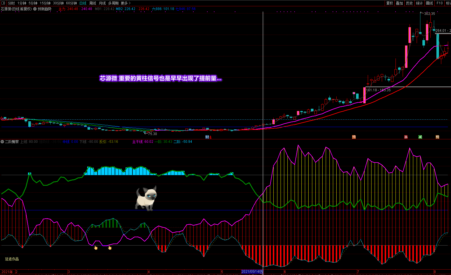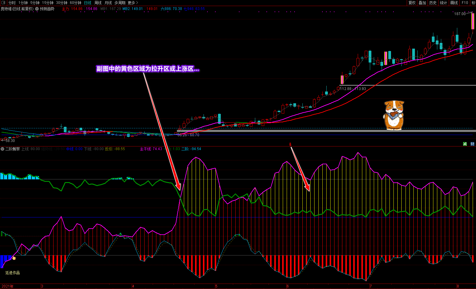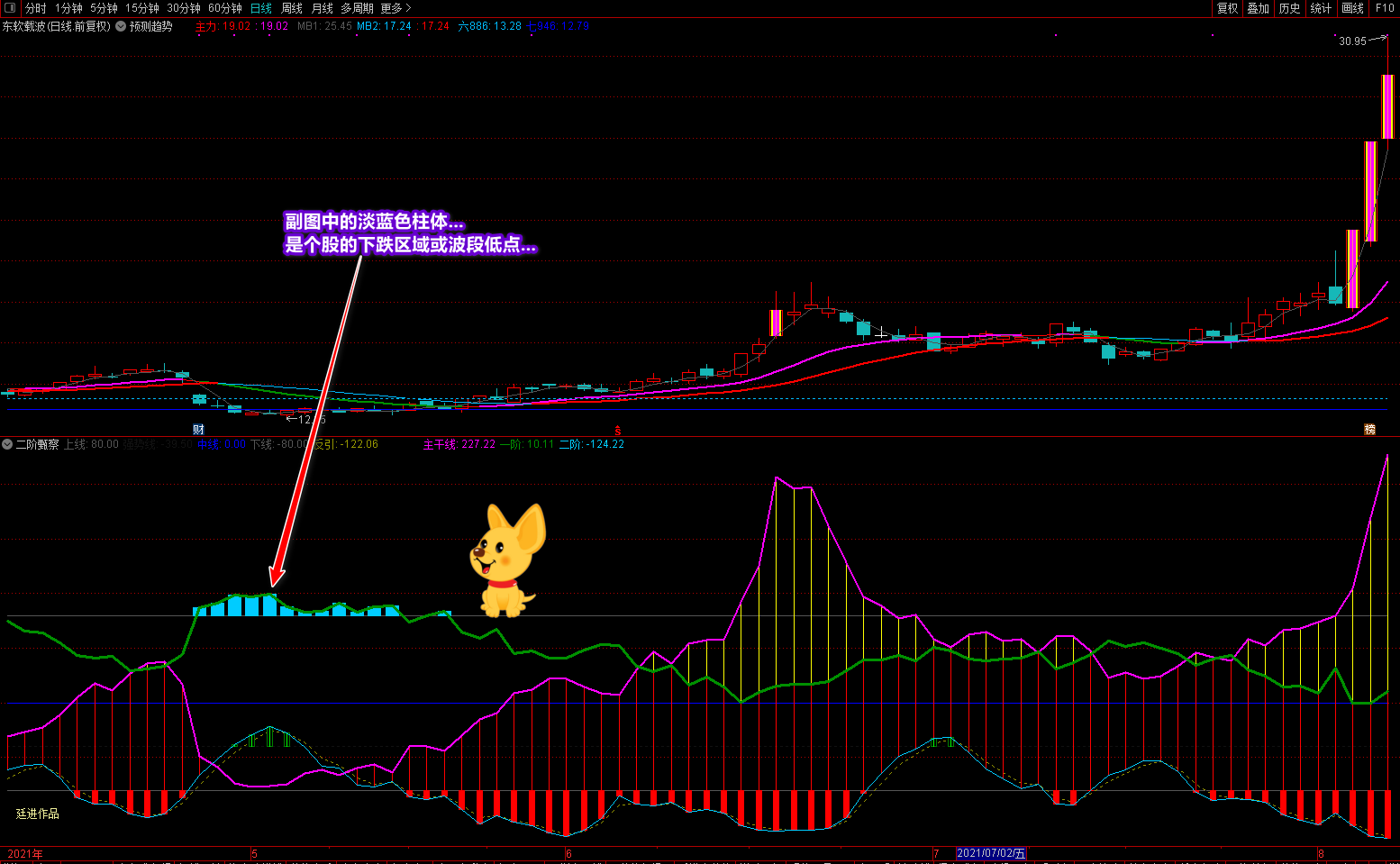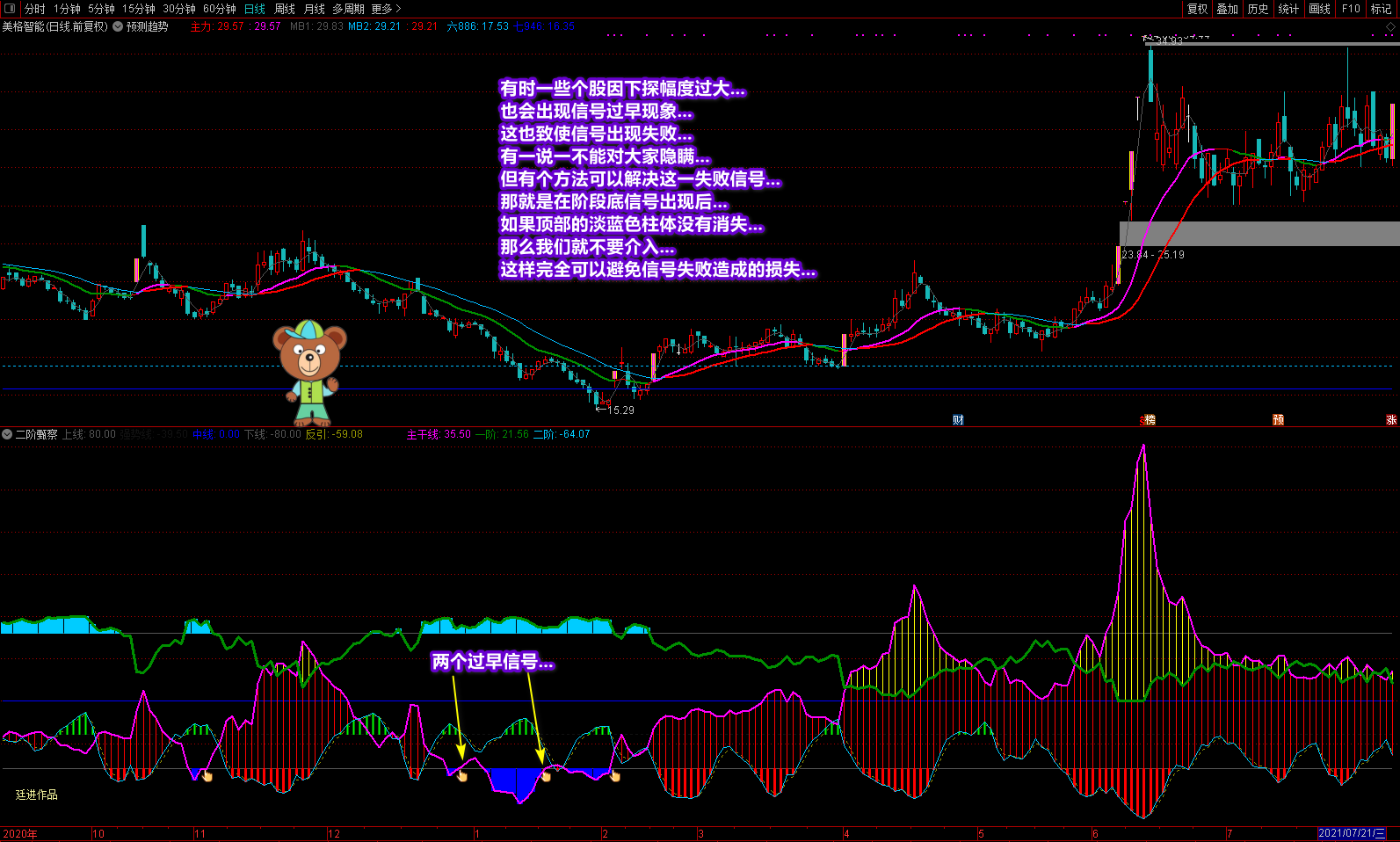 这次发表的《二阶甄察》副图指标,最大的突出点在于可以利用指标的多点信号及时把握个股的操作和进出,并利用颜色提示个股目前处在什么趋势,将来又如何去发展,什么时候可进,什么时候不该进,再配合附送的主图《预测趋势》,可以完美的对个股进行稳定操作。特别是副图中的多点信号和多点提示,对个股的操作是其它指标不可替代的。具体的操作说明和要领已经在截图中详细讲解过了,这里就不再赘述。