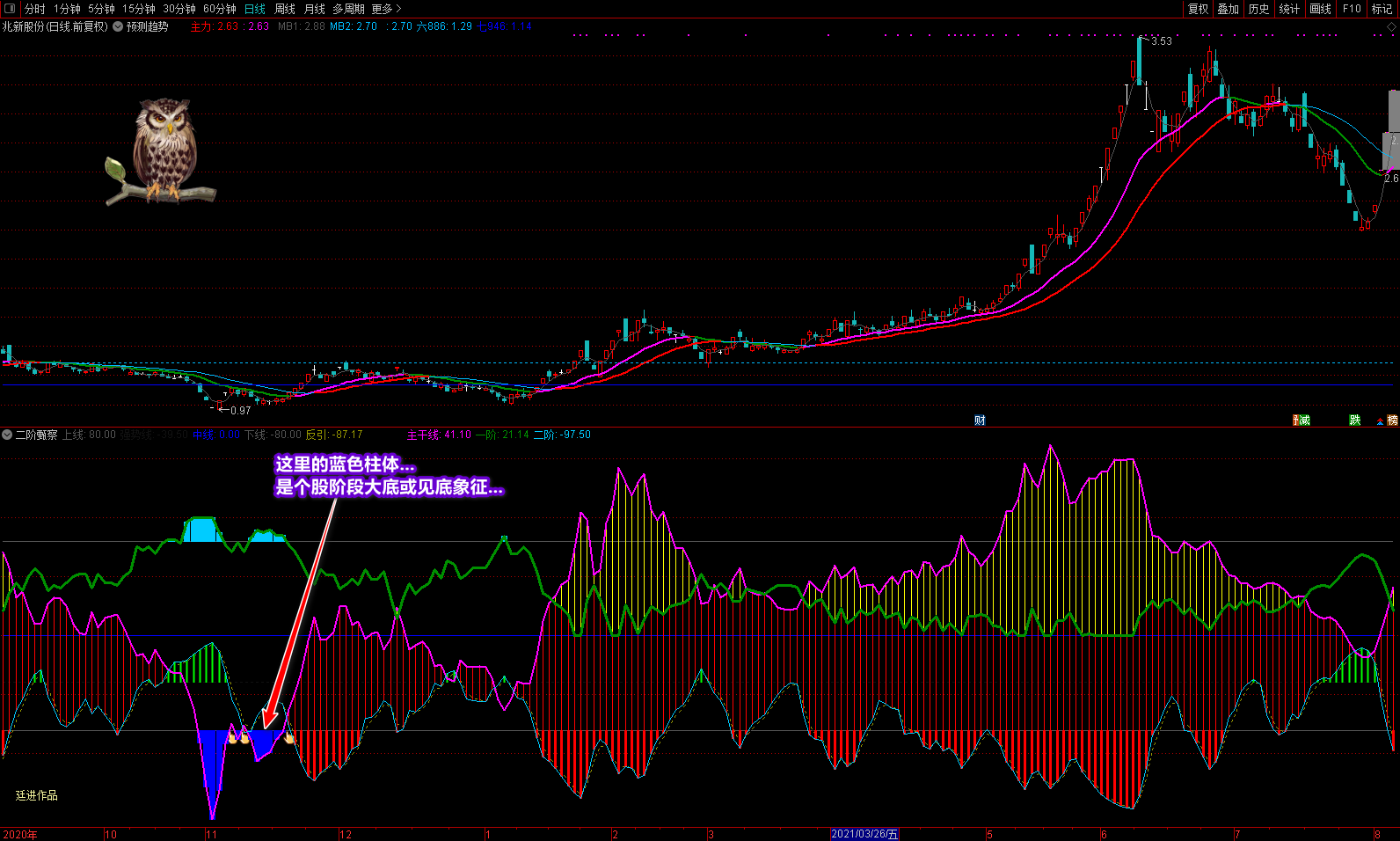在新疆库尔勒出差一个月,周五回到江汉大本营。出差期间一直在想这个指标。我们平时看到或者使用的一些东西都是比较简单的,很难判断趋势,所以我们总是想用几条线来更好的展现当前的趋势和未来的趋势。去新疆的时候没有带笔记本,所以只有在手机上编写成了这个《二阶甄察》副图指标,这两天我导入电脑优化线条和颜色。