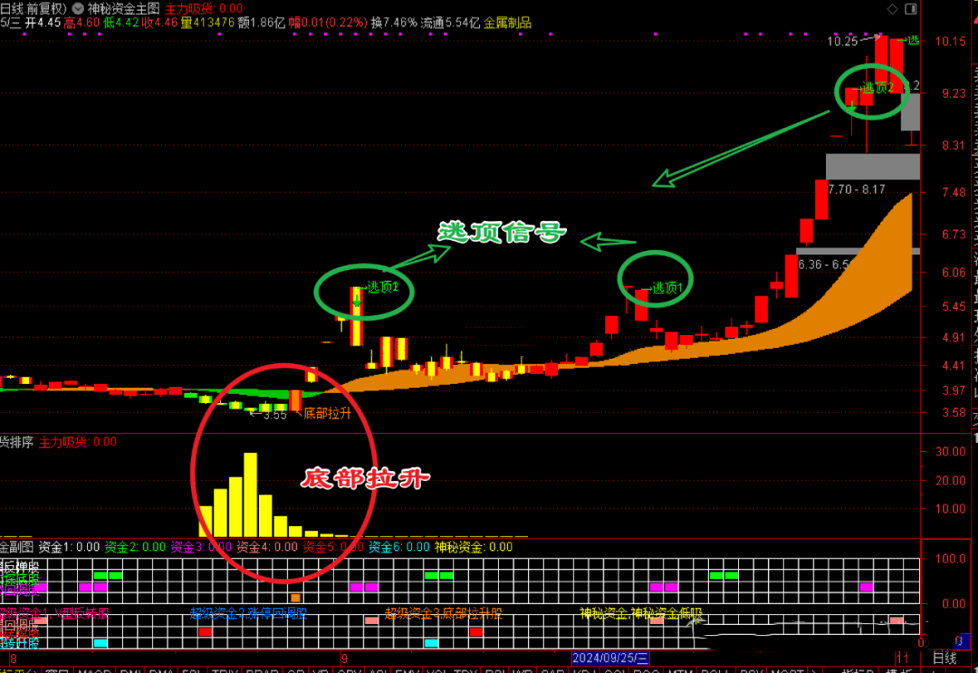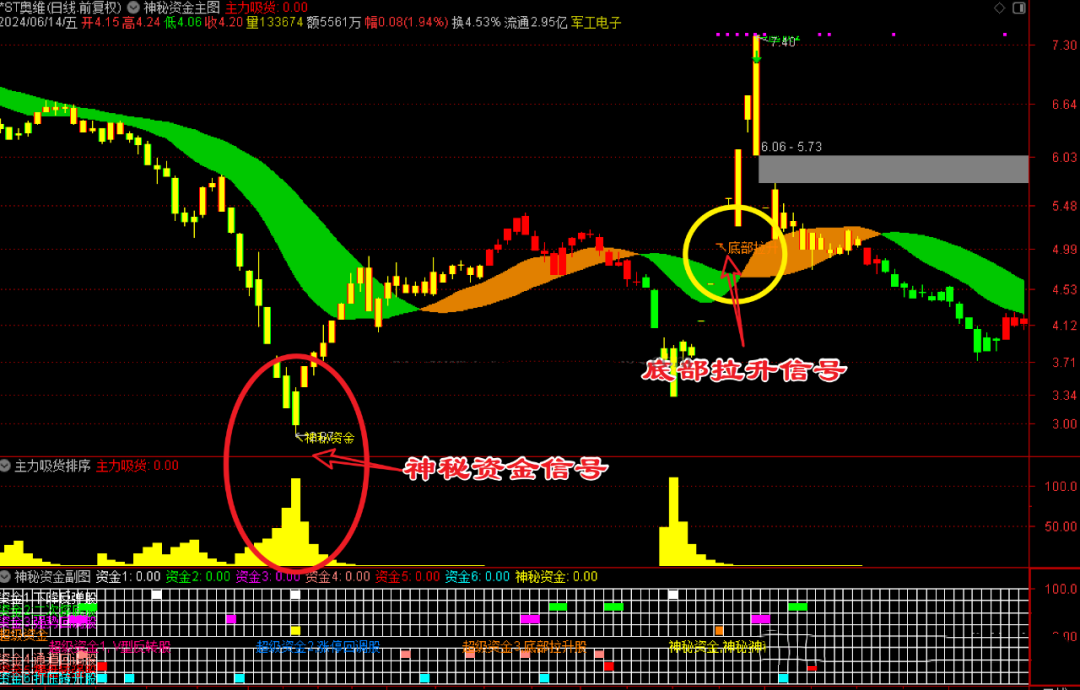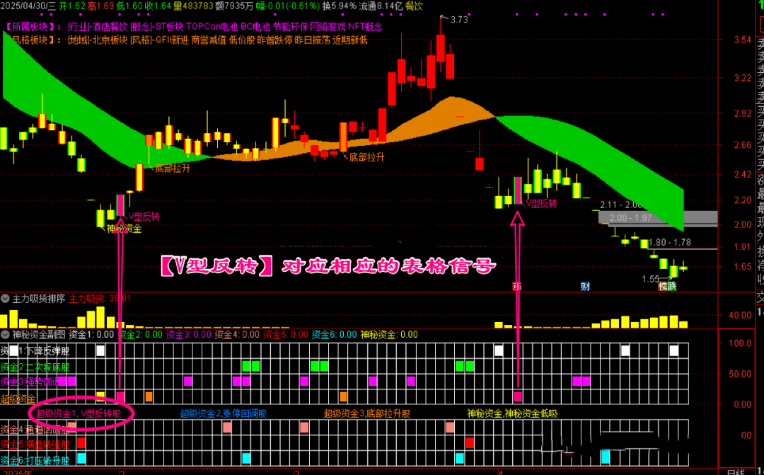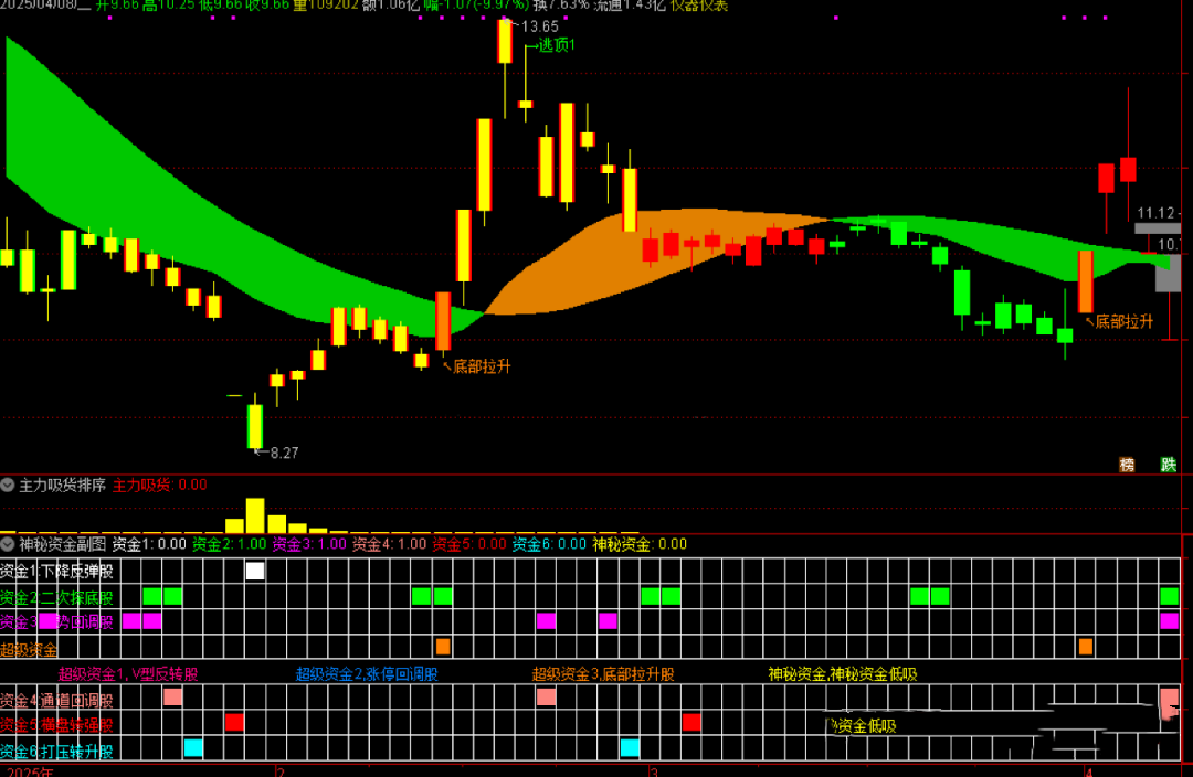 1、神秘资金:神秘资金低吸,每个资金颜色字体对应同颜色的量柱。