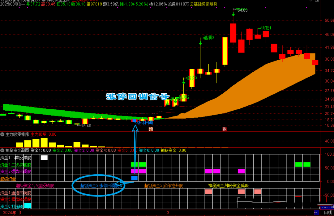 3、资金4(浅红柱)出现却跌破20日线(假突破真套人)超级资金1+资金6同时亮灯,八成是庄家对倒(看龙虎榜识别)。