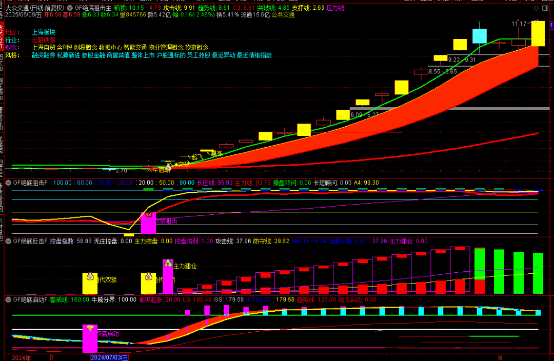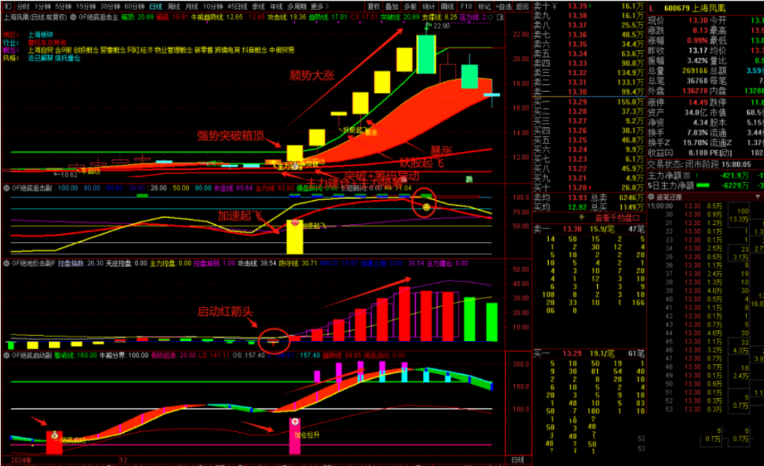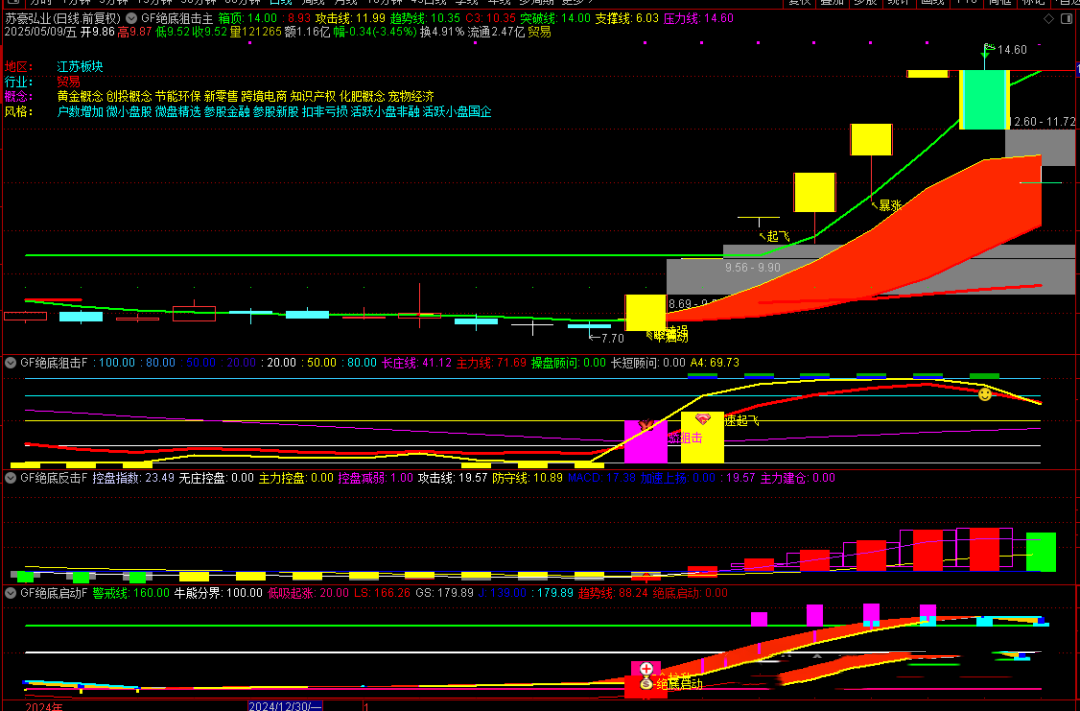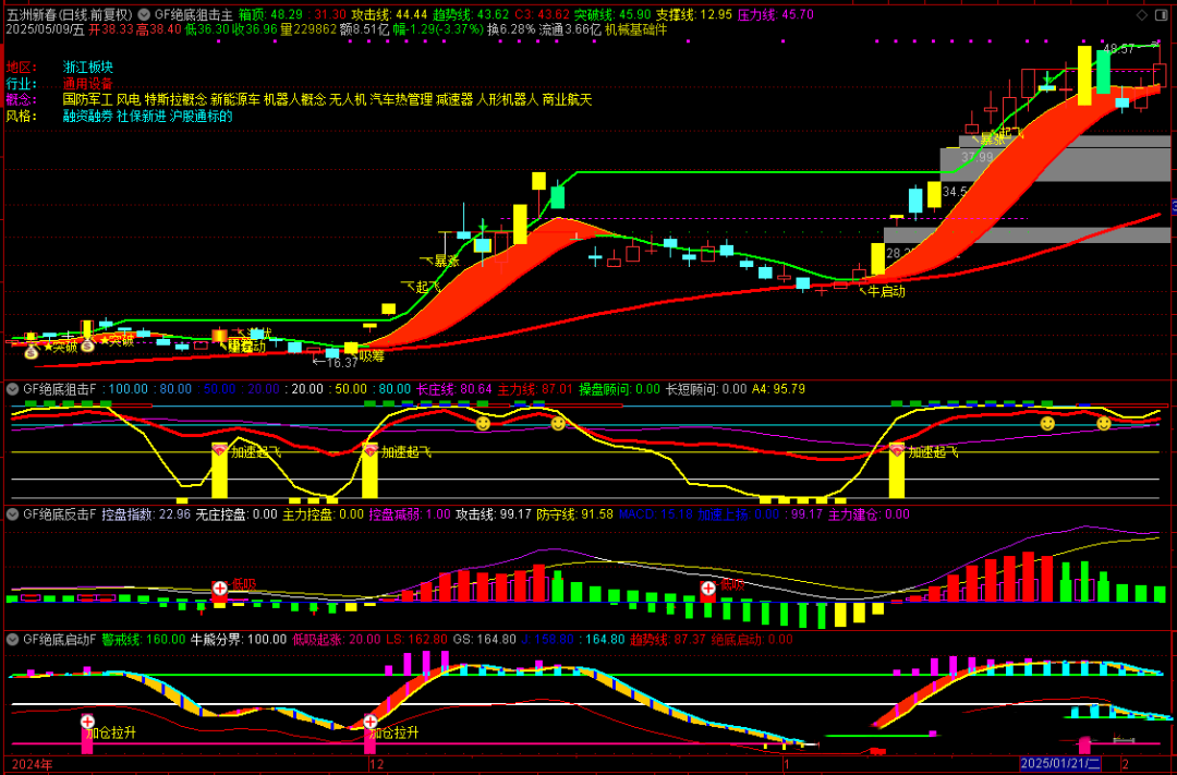 4、加速起飞信号为股价拉升信号,特别是主力线在建仓区内金叉长庄线的基础上出加速起飞信号吃肉概率大