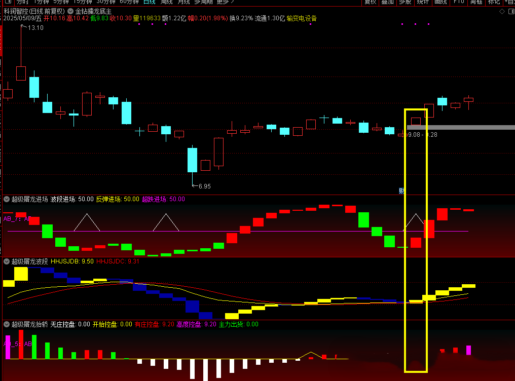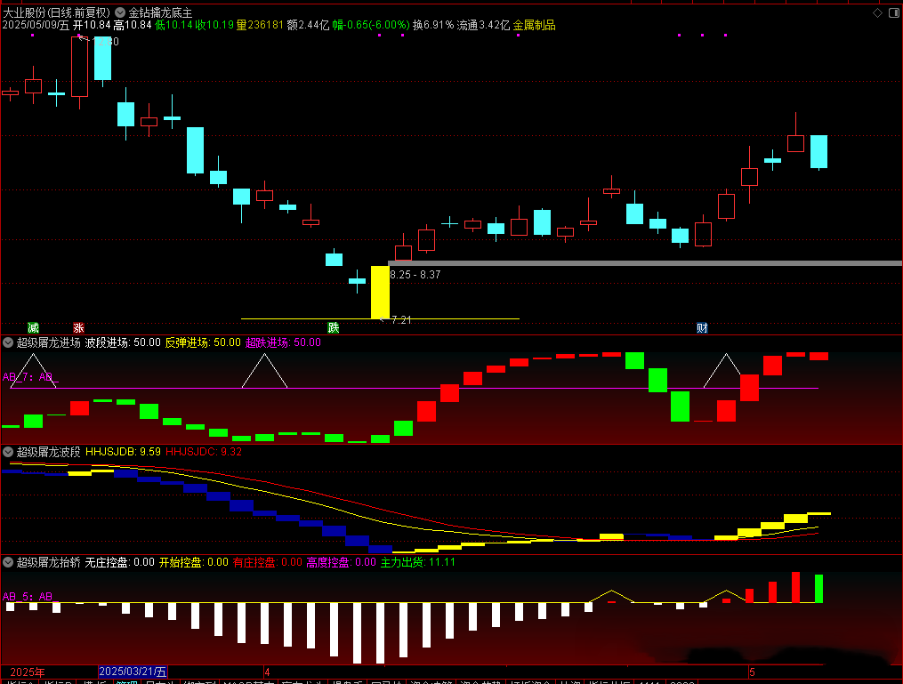 选股策略:主图蓝色之后的首个黄色 + 超级屠龙抬轿出现黄色三角 + 超级屠龙进场出现白色三角 + 超级屠龙进场信号为红色。