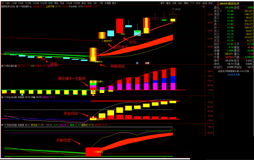 4、出现共振低吸信号为波段启动信号结合趋势线做判断成功率更高