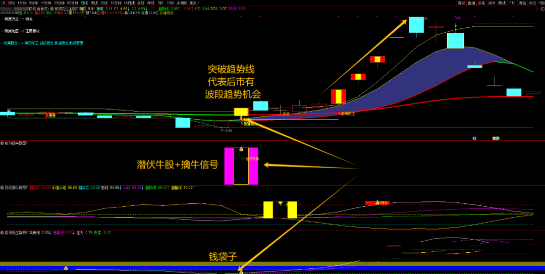 1、潜伏牛股信号为股价启动前的埋伏信号,结合趋势判断成功率更高