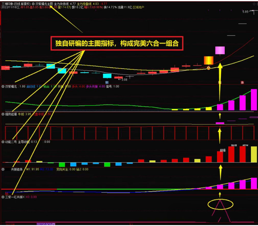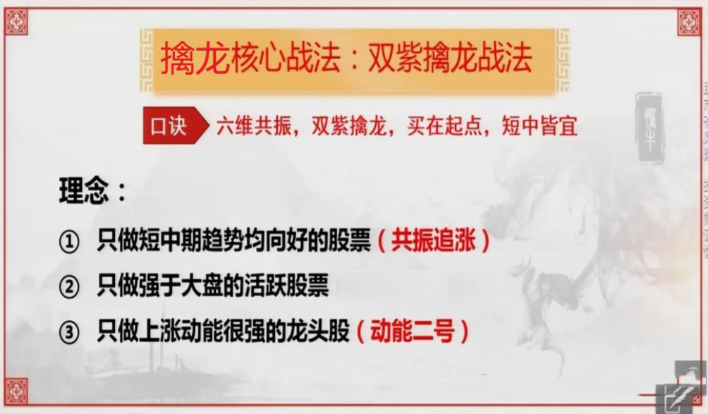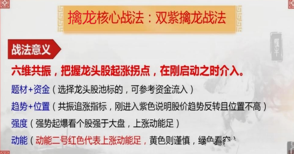 双紫擒⻰战法:是指共振追涨副图和强势起爆副图出现紫⾊柱体信号,称作双紫,在加上动能二号副图出现红柱,称作⼀红,加起来称作:双紫⼀红,是最强信号。