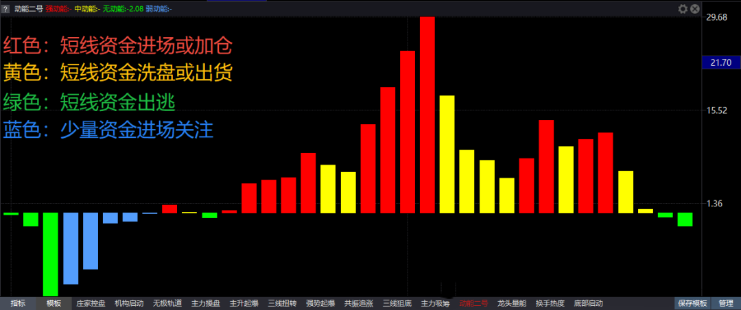 3、主导动能出现⻩⾊,但市场整体⾛势较强、价格涨幅较⼩,可继续持有;绿⾊柱状表⽰资⾦主导价格下跌