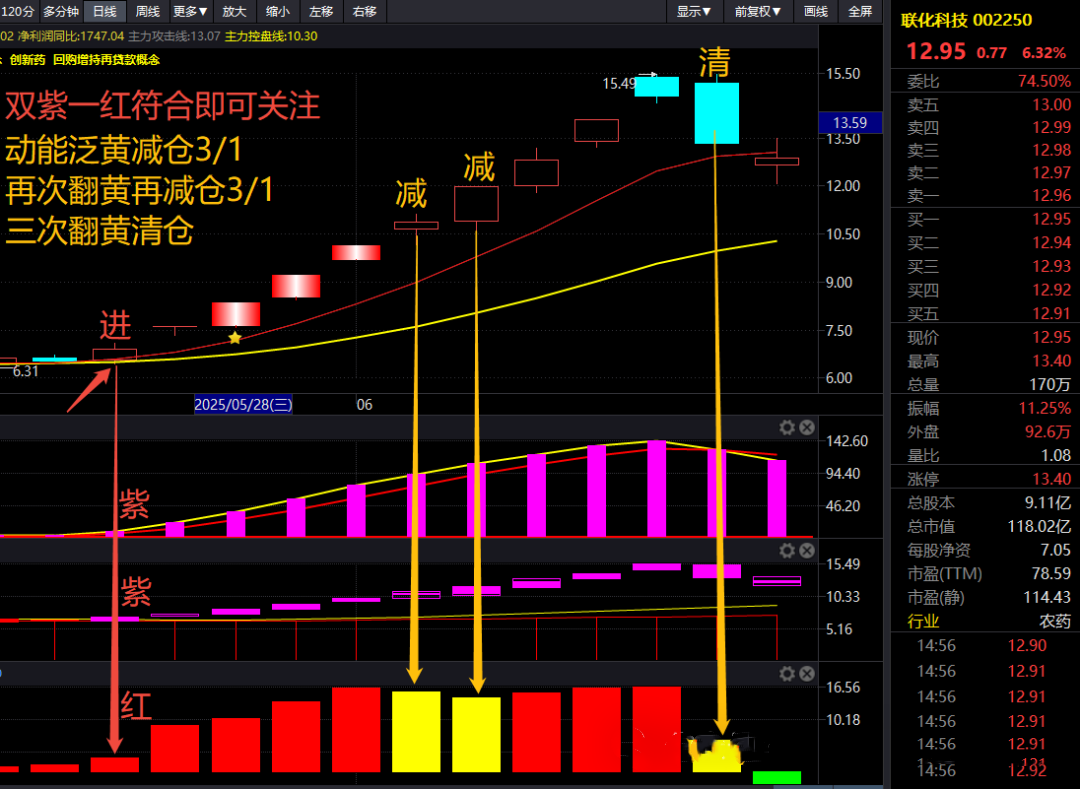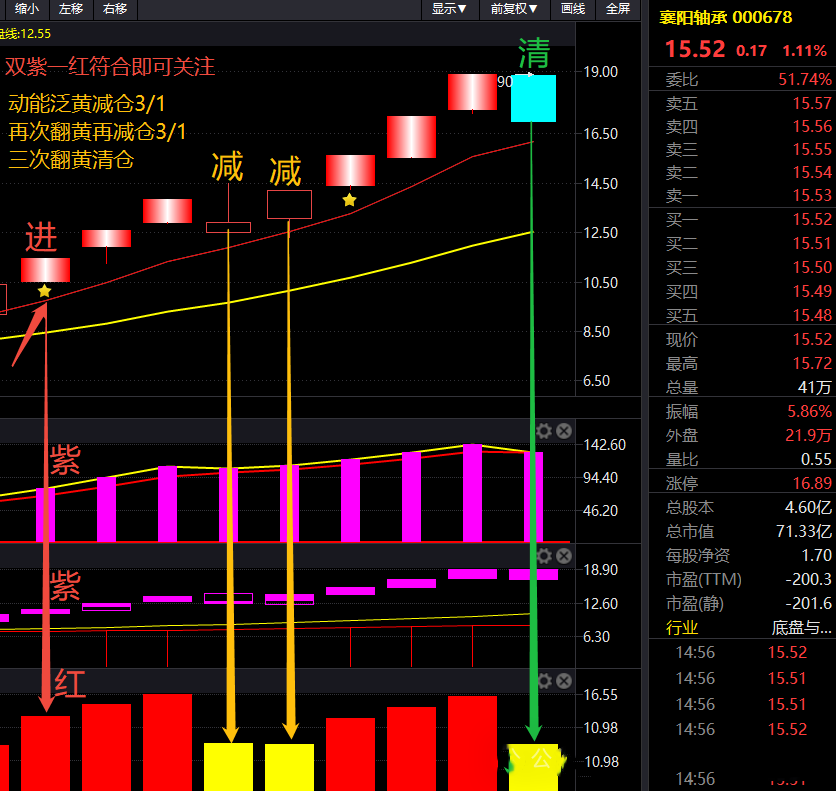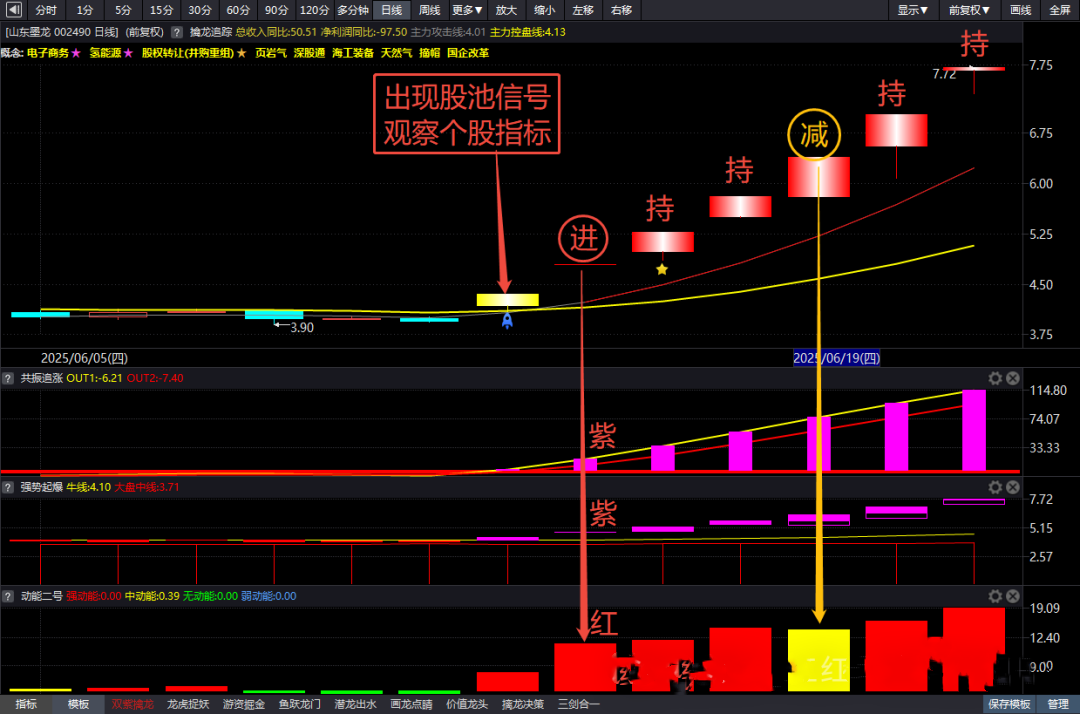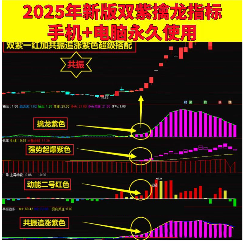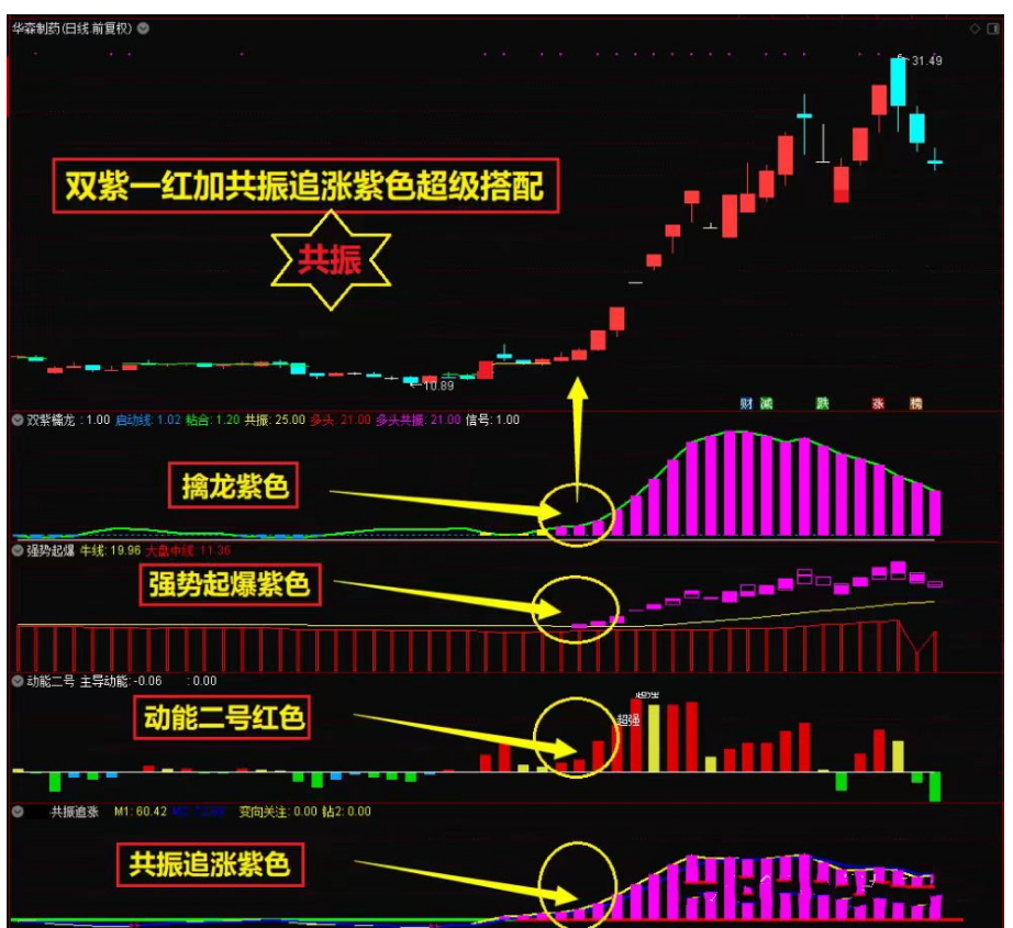 新版双紫⼀红擒⻰战法:是由共振追涨副图和强势起爆副图中同时出现紫⾊柱体信号提⽰,加上主⼒动能副图中出现红柱信号提⽰,三个信号产⽣共振提⽰,称之为“双紫⼀红”。