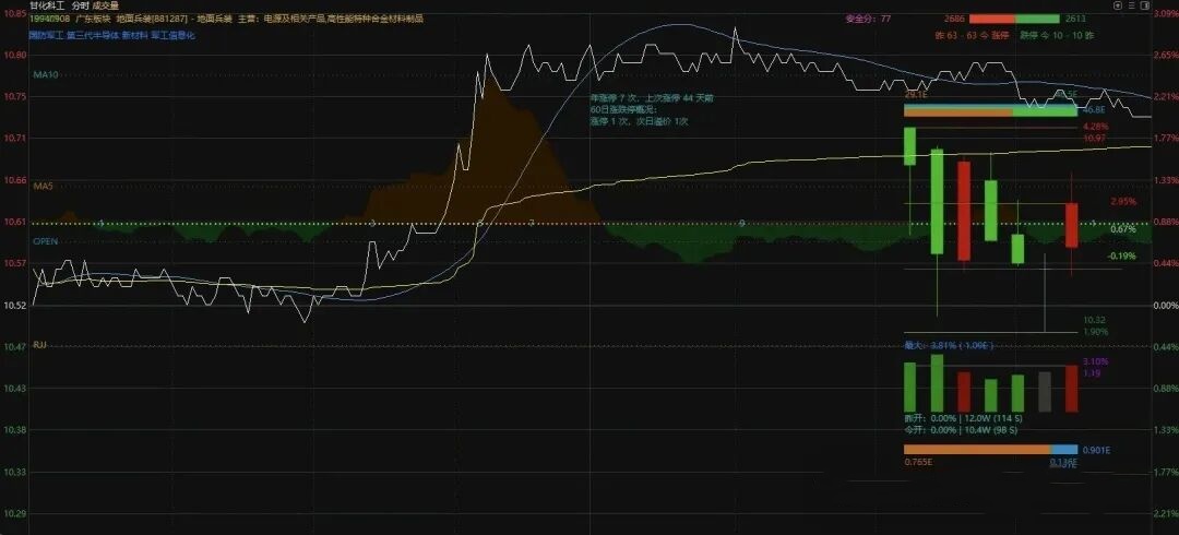 另外,如果当天出现涨跌停,则最后的量柱会出现一个柱心,是当天封板前的量能,用于观察冲板量与前量和当天量的比值。