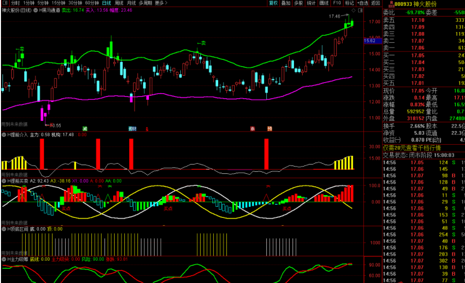 所有股票都在黑马通道的上下轨中运行,当触及到下轨必向上轨运行,反之亦然。当股价运行到下轨是买入的时机,当股价运行到上轨是卖出的信号。