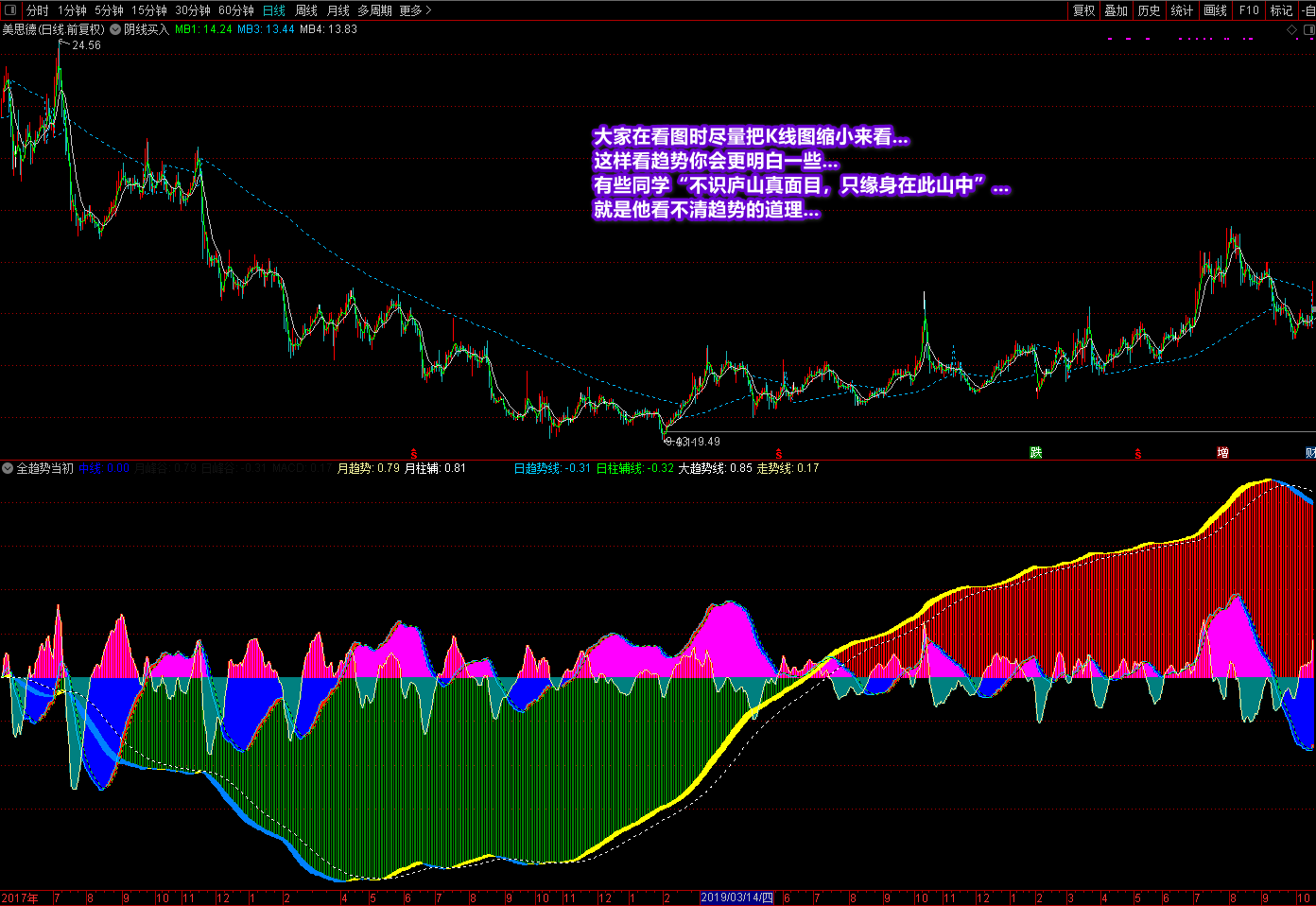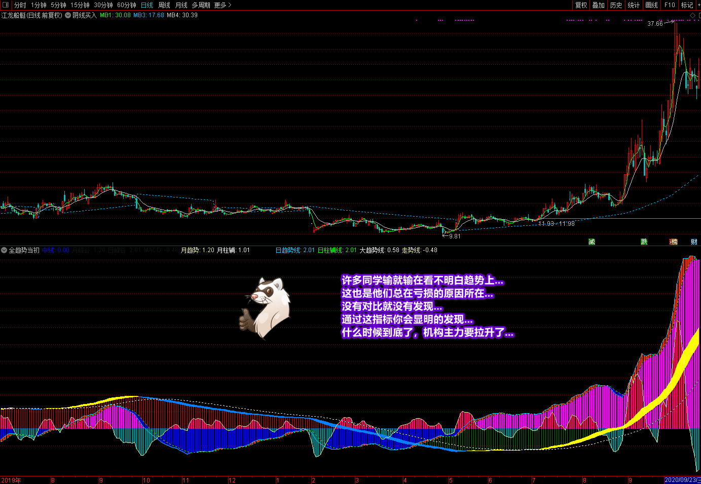 以前经常跟同学提起;一个操作股票的散户应该有一定的市场意识。可能有些同学总是不知道市场的意义是什么或者找不到盘感。这个指标可以让你这个不懂市场的人一眼就看出当前的趋势和盘感,让你清楚的知道哪只股票当前在涨,哪只股票当前在跌。很多学生因为看不清趋势而吃了亏。原因是普通的指标只会让你在恐惧和颤抖中看到几天或未知的趋势。特别是吃过亏的同学通过手里有的或高价订购的所谓“秘笈”指标也从不敢下重仓投入,在时间和资金的赢利上受到制约,所以想大幅赢利是非常困难的。为什么我说在媳妇从20亏损到8万多时我接手在这些年的时间可以扳回本呢?因为我只做一个又一个大趋势。这波完了之后,我会做下一波别的股票。可以说每天都有牛市。当初,a股市场有3000多只股票。可以说有很多股票。3000多只股票中,可以说不断有牛股。