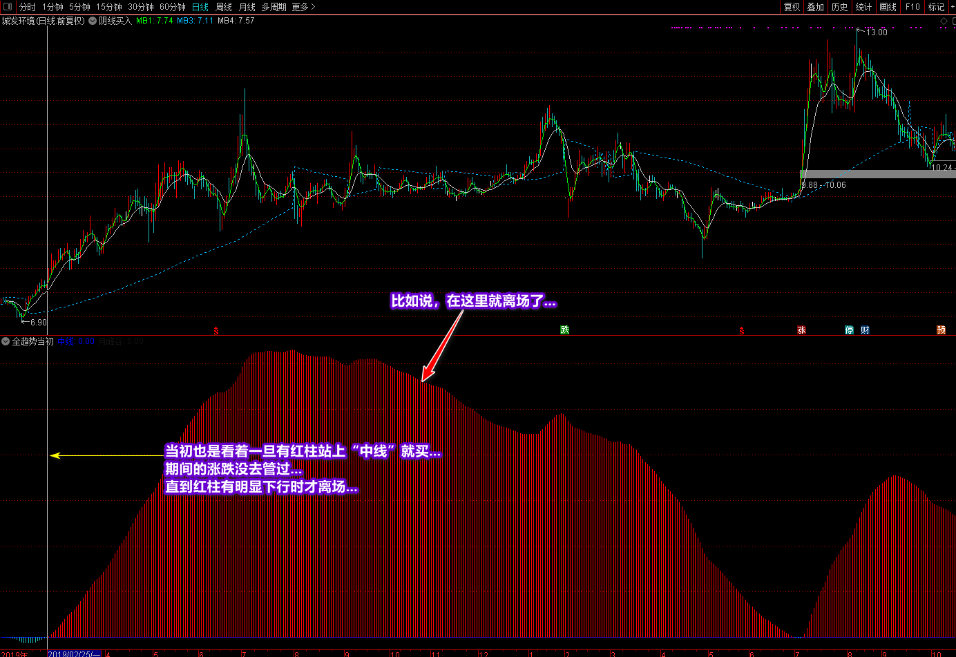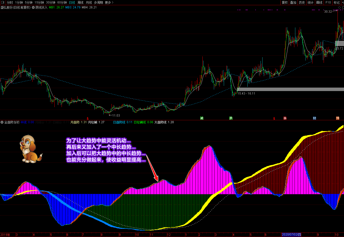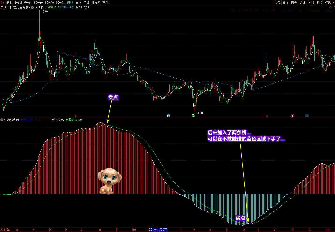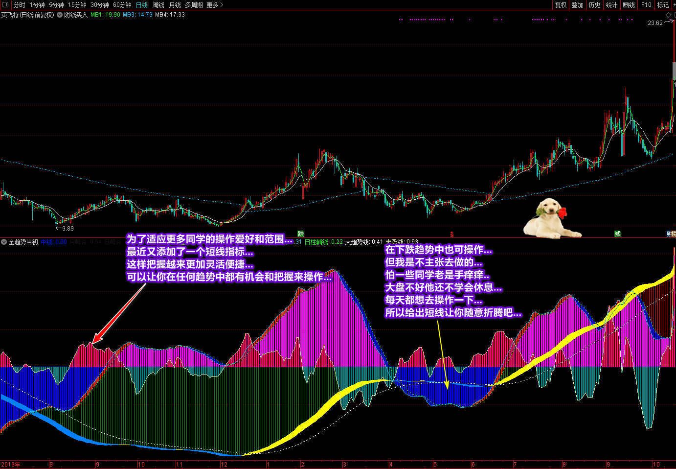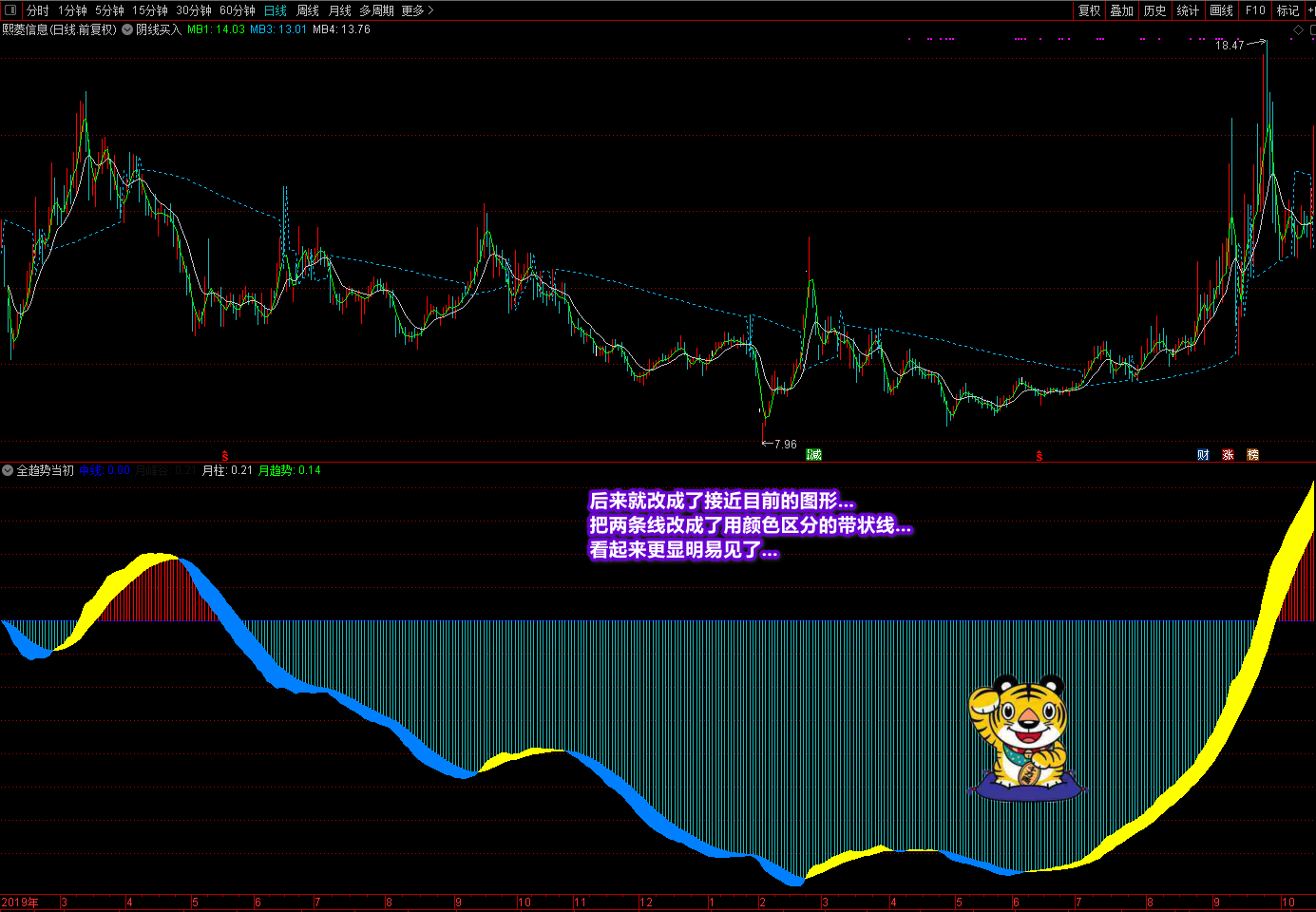 《廷进全趋势》指标最初设计是在2015年下半年,当时为了总结和验证股市中的经验术语“趋势为王”而写出了初稿,后经反复修改,一直自己按当初的简单的二根线操作,出乎意料的是,效果相当不错,基本上不看基本面、业绩、财务数据都比较容易操作。因是上班族为了只在长线上获利而创作了此指标,后经过一年多的试用调校和校正,可以说亏了不割肉,赢利不逃跑,只看趋势操作,基本上每一波操作没有亏损过。这也是庄家最怕的操作手段。当然,当初的操作确实没有现在的赢利大和多,因为当初不可能像现在这样在上涨的路上看透一只股票的调整或者洗盘,也没有现在这么低,从而实现利润最大化。