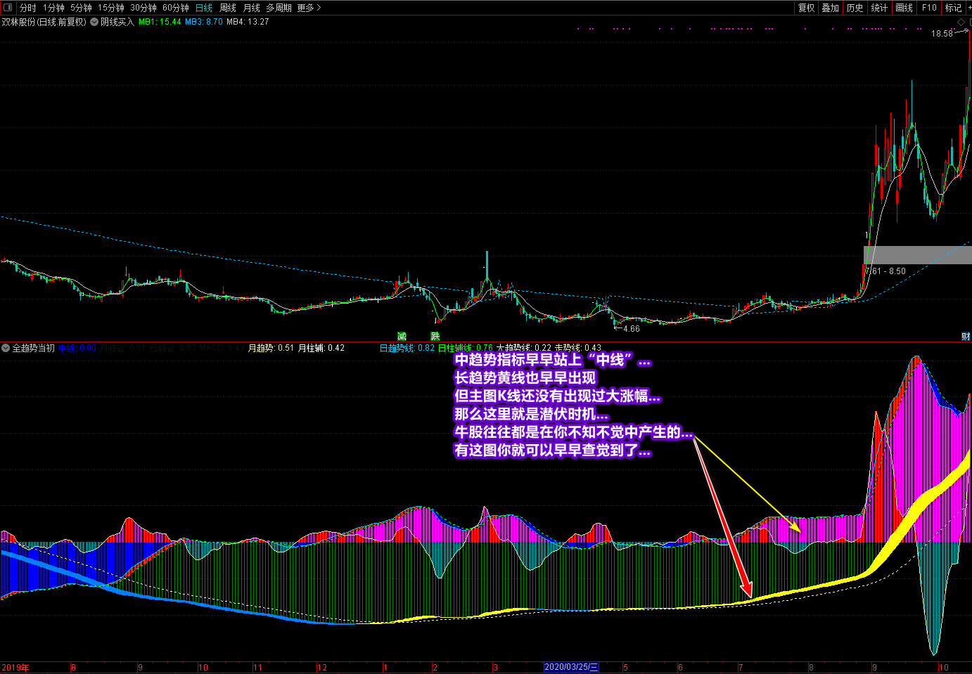 在股市无情的风险地带,想赢利些轻松之财谈何容易?不少同学因为操作不当、不会看趋势、盲目抄底损失过半,愿望与理想越来越远。股市里有句话我经常跟同学提起,那就是“趋势为王”,把握不了趋势就把握不了利润。那么,部分学生亏损的主要原因,看了一下之后,就是趋势。他们中的一些人经常误判趋势,在下跌趋势中买入。即使有些学生跟上了上升的趋势,最大的困难还是拿不到票。我之前给过一些指标,如果他能严格按照我的截图操作,他总会盈利的。但稍微大盘或所持个股有些震荡他就跑了,到头来个别同学还是不会操作。你也不想一下我以前说过的话,大凡机构或庄家在拉升前都有个洗盘过程,即使给你一只新的股票,如果从表格上看不清楚庄家的洗盘动作,你也会错失良机。以今年的大牛股天山生物为例,从6月19日到6月29日连续5天下跌,但周线走势一直在“中线”上方。我明确的知道这是主力在洗盘。