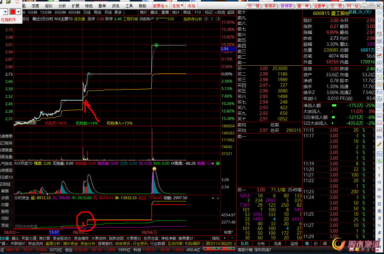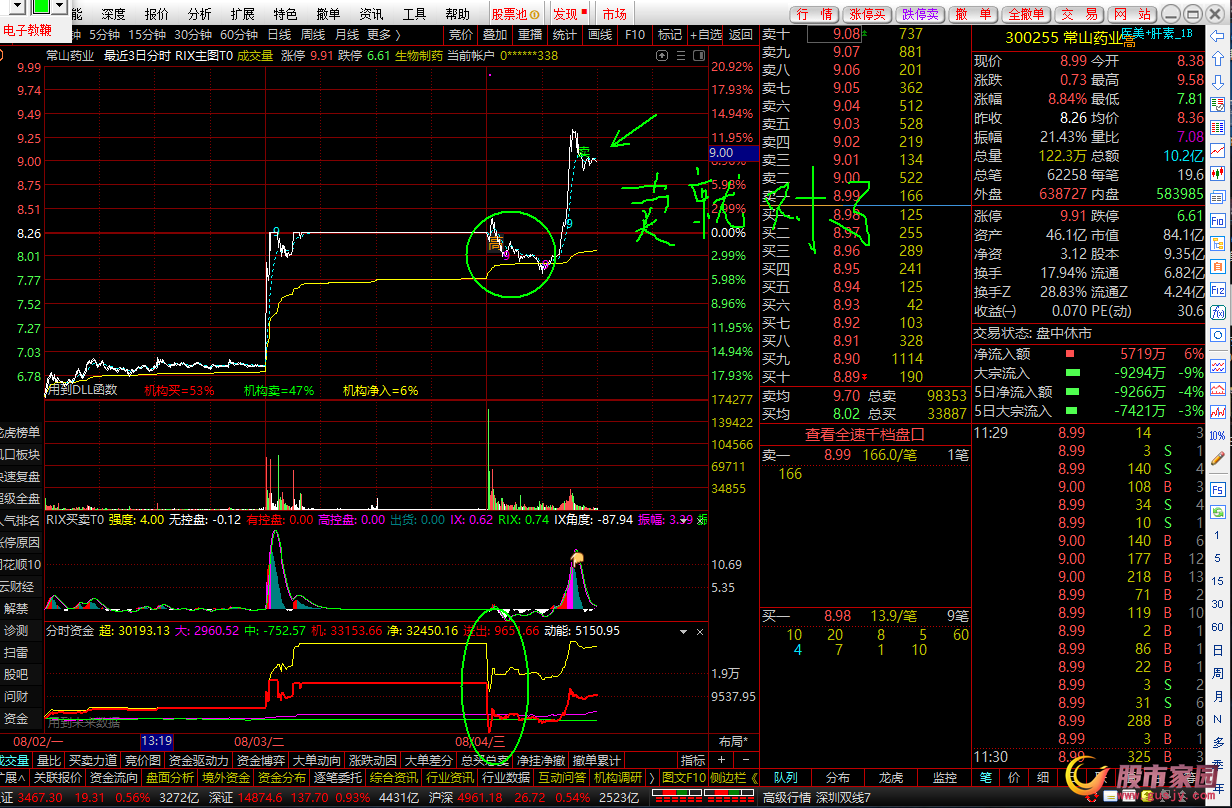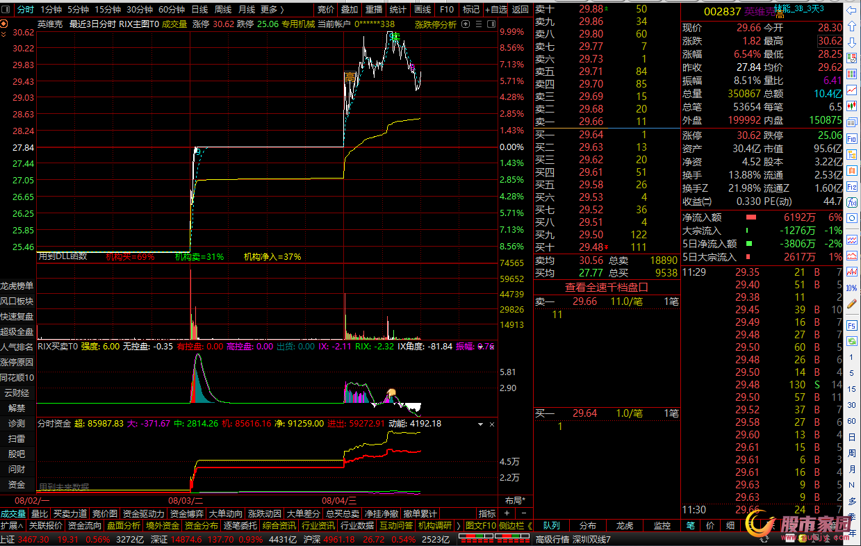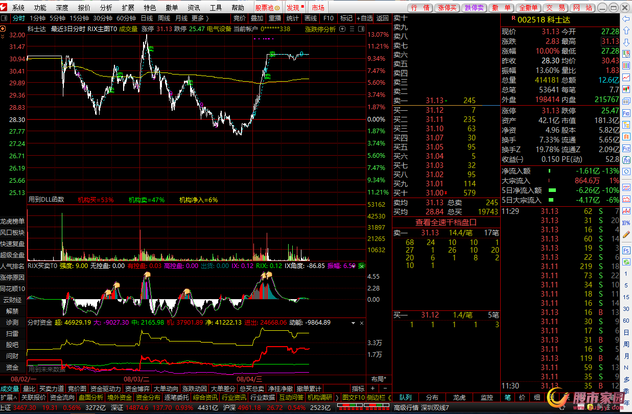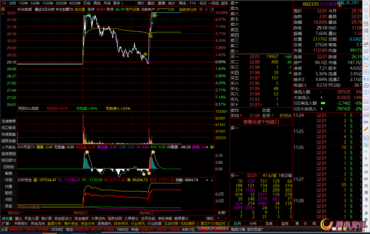 今天最典型的就是科华数据这股,这是3天的分时情况,可以看出,主力昨日竞价进了大量资金,大盘下跌,股价跌回0%,但机构资金和超级资金没有跑。
