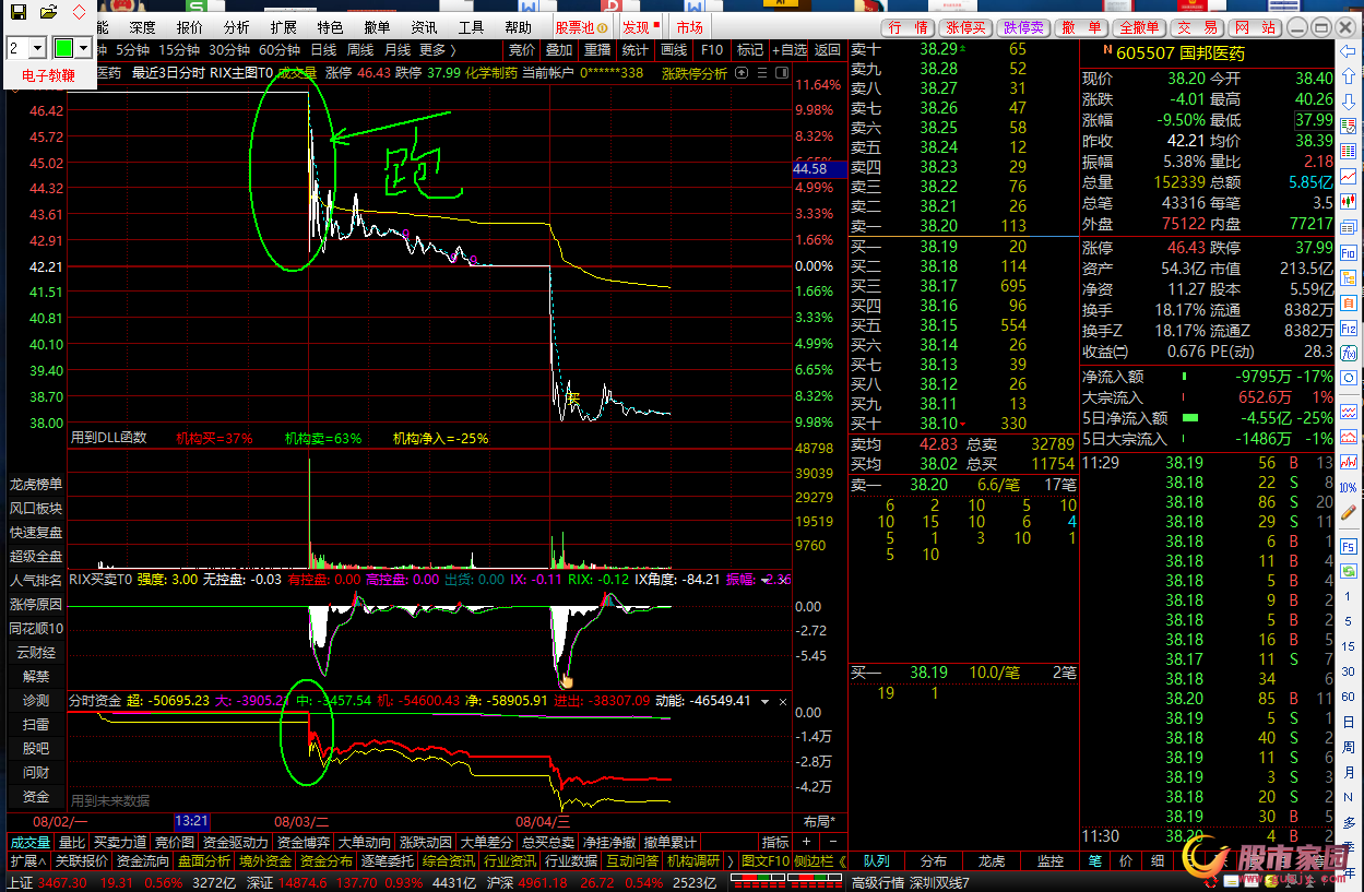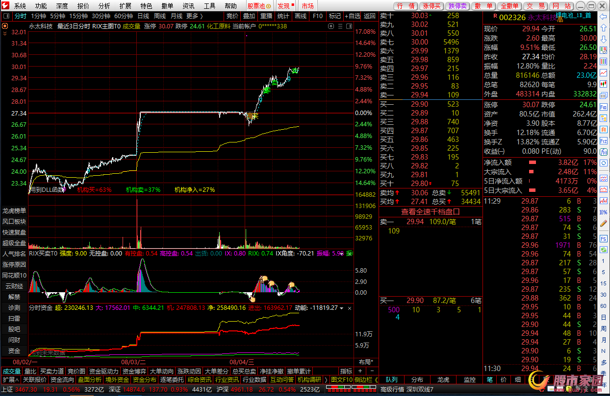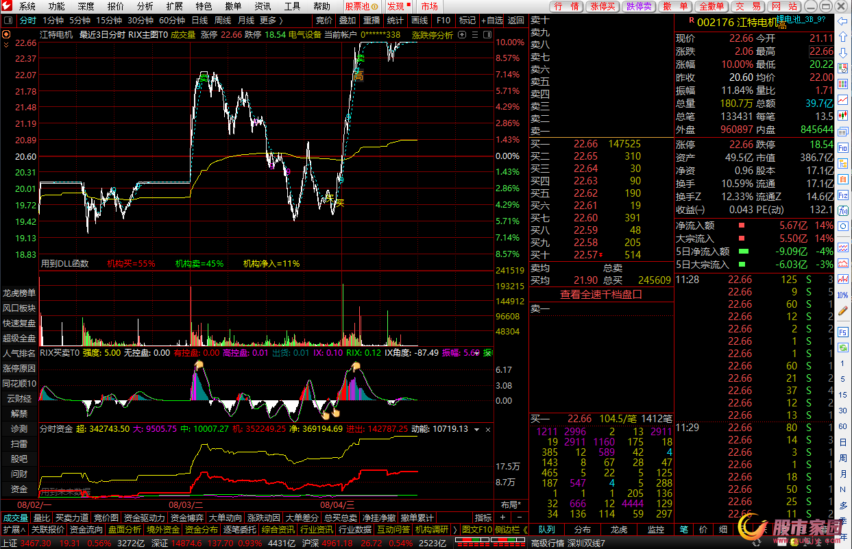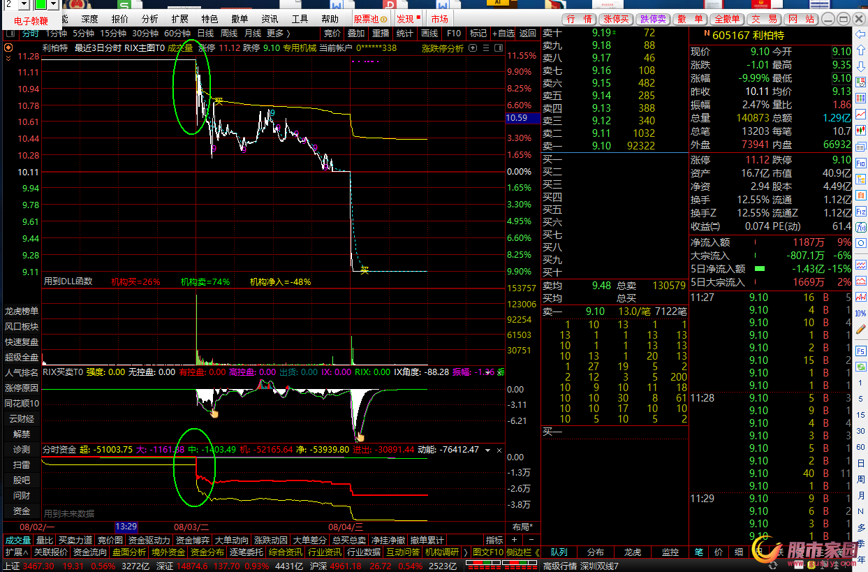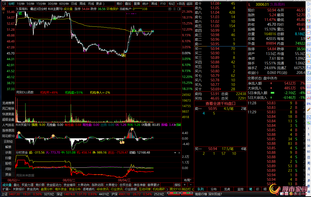 今天最典型的就是科华数据这股,这是3天的分时情况,可以看出,主力昨日竞价进了大量资金,大盘下跌,股价跌回0%,但机构资金和超级资金没有跑。