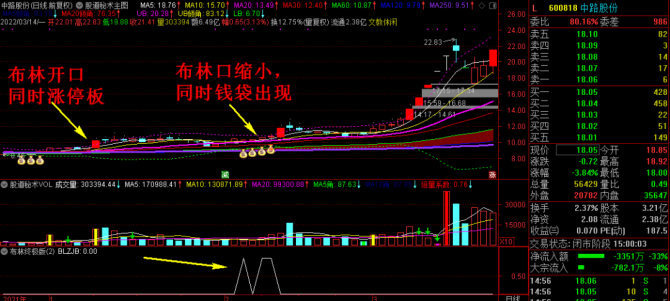 如上图,前面布林口突然放大,同时底部爆量,而且出现强势涨停板K线,一般代表庄家携带资金入场,入场建仓完之后,庄家会有一波洗盘,洗盘处布林