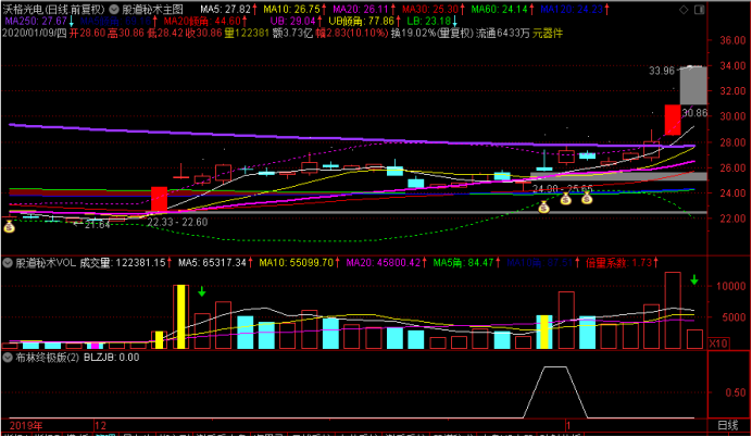 当然,你或许说我是马后炮(【迦南科技300412】可是马前炮),我们现在来一支创业板的现在正发出布林终极版信号的股票,如下图的【银邦股份300337】