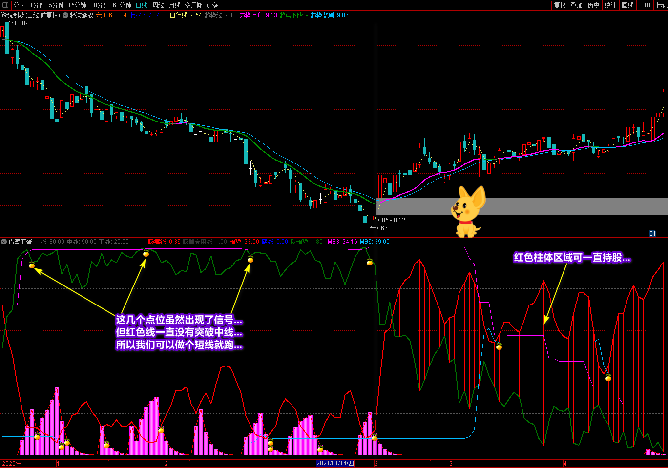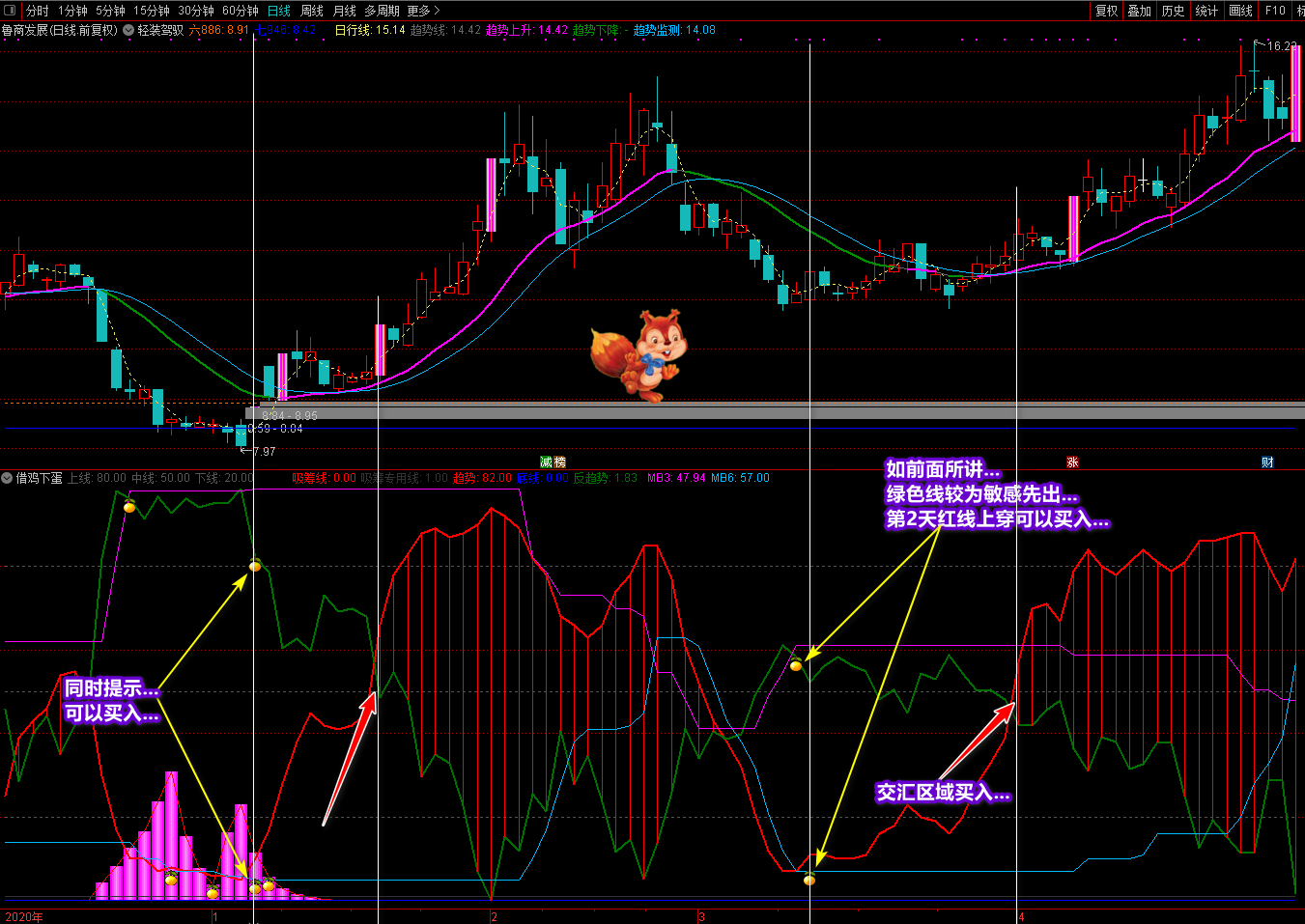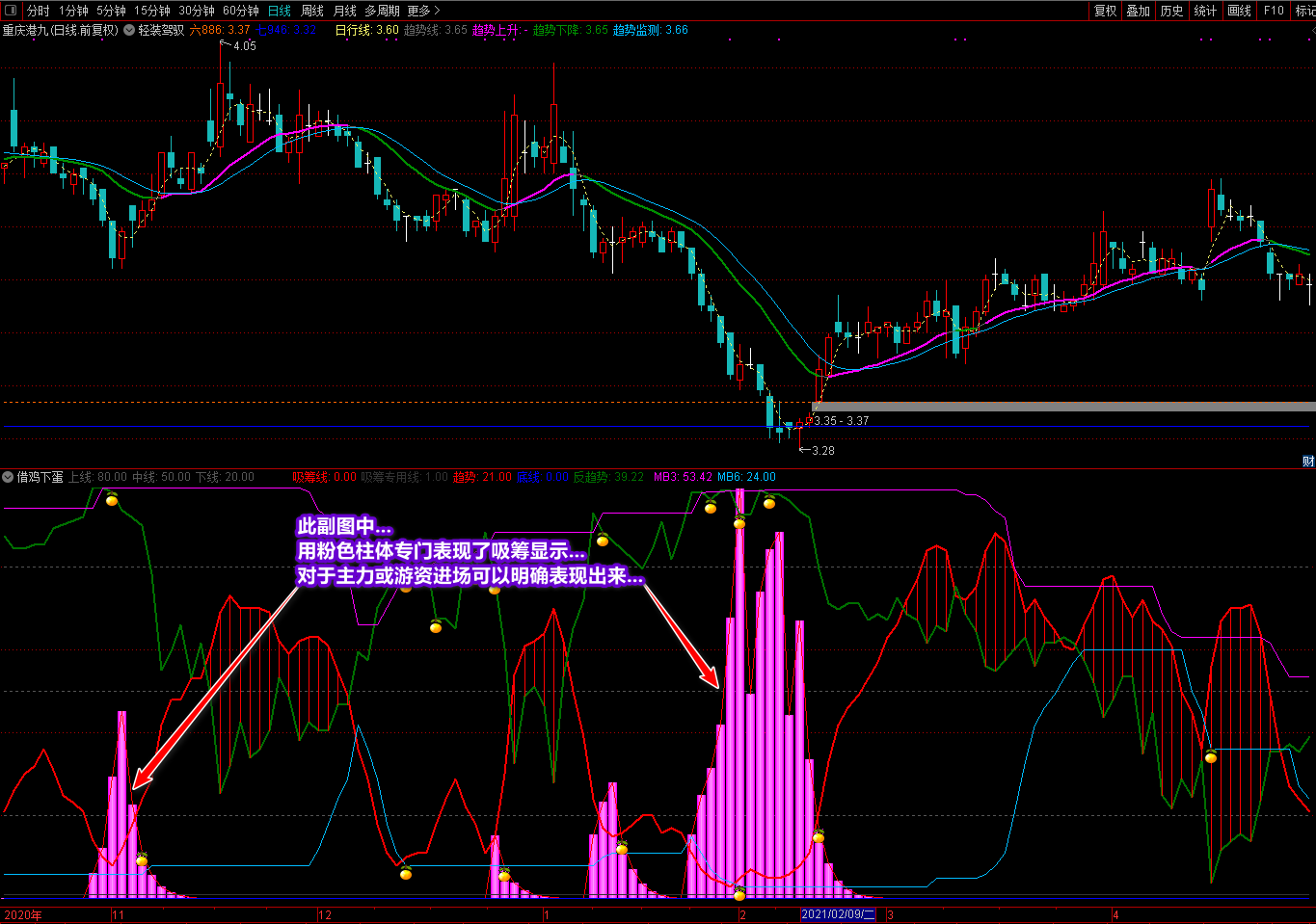 《借机下蛋》副图指标旨在让同学们通过指标的简单运用和指标编写的意图来容易上手的操作和把握趋势过程,力求找到上涨的股票捷径,避免盲目买入带来的损失,从而达到自己想要的目的和目标,指标力求灵敏快速,避免拖泥带水,在趋势反转前有明显的提前提示,对操作者非常有价值。