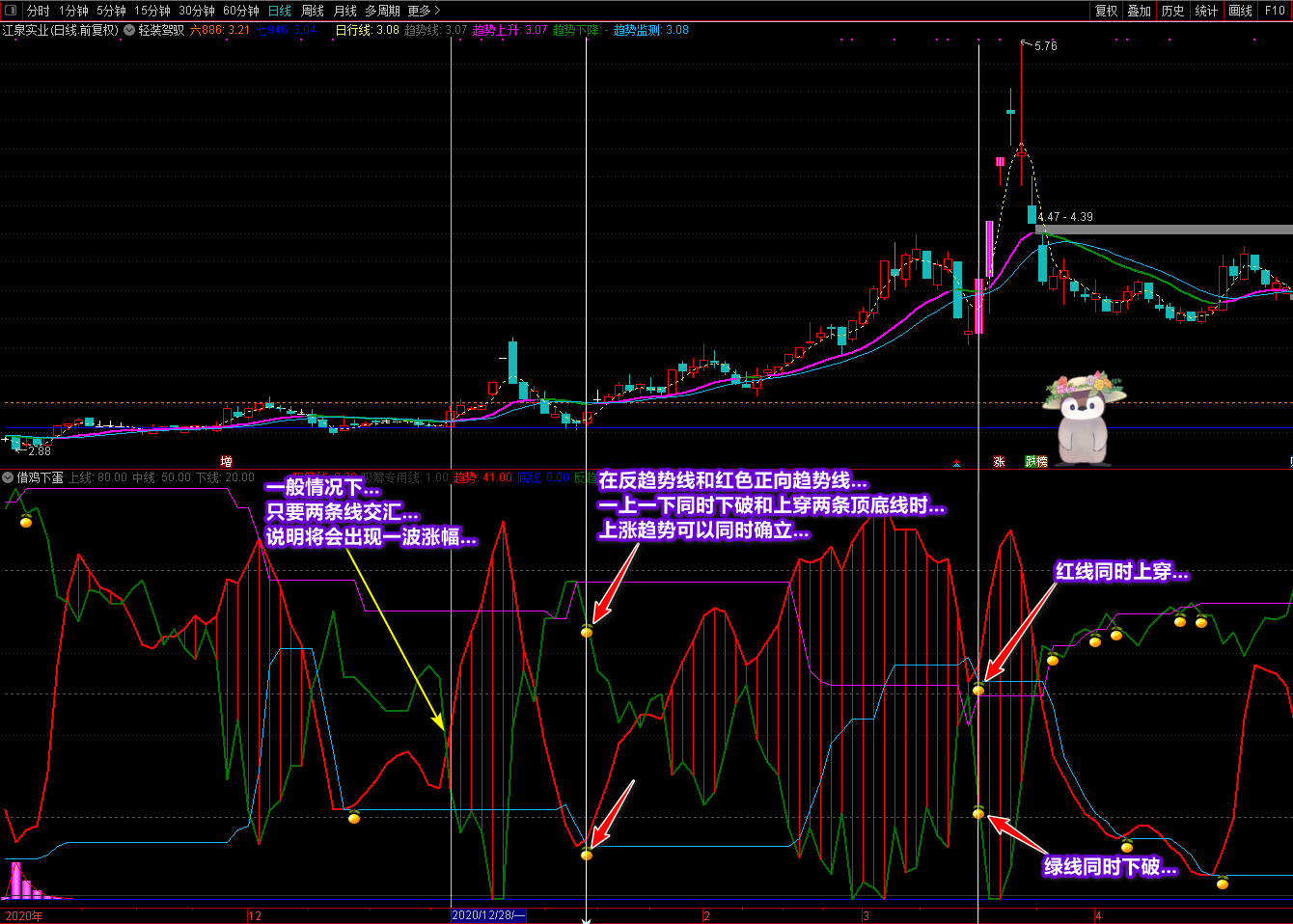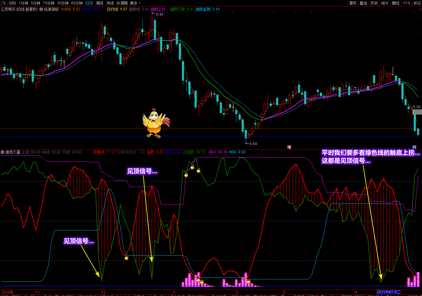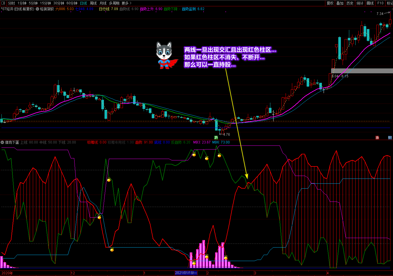 《借机下蛋》副图指标旨在让同学们通过指标的简单运用和指标编写的意图来容易上手的操作和把握趋势过程,力求找到上涨的股票捷径,避免盲目买入带来的损失,从而达到自己想要的目的和目标,指标力求灵敏快速,避免拖泥带水,在趋势反转前有明显的提前提示,对操作者非常有价值。