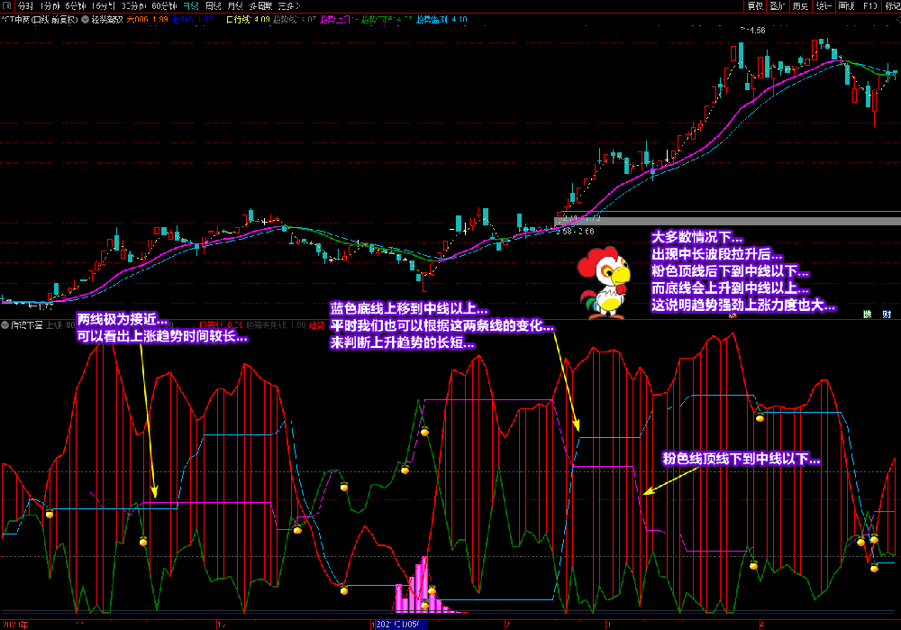 其中的共振点选股已经在副图的WOD文档中已经给出了,你可以再去看一下下载解压后的WOD文档第二个标题即是共振点选股。你提到的另一个问题是如何找到未来会上涨的更好的股票。你可以打开a股的所有股票,看看每只股票都会有一个涨跌的操作过程,而不是连续上涨。即使是中长期上涨的股票,也会有一个震荡调整的过程。从来没有股票直线上涨。《借鸡下蛋》副图指标就是给你一个清晰的涨跌过程,让你避免失误,在红色上涨柱区域买入。与一般趋势指数相比,相对更容易把握和操作。如果你想一直在红柱区域操作,那么你可以找到红线一直运行在“中线”上的股票,这样你就一直处于上涨通道或者强势,你就可以实现你预期长期上涨的股票。你可以参考下一张图片。