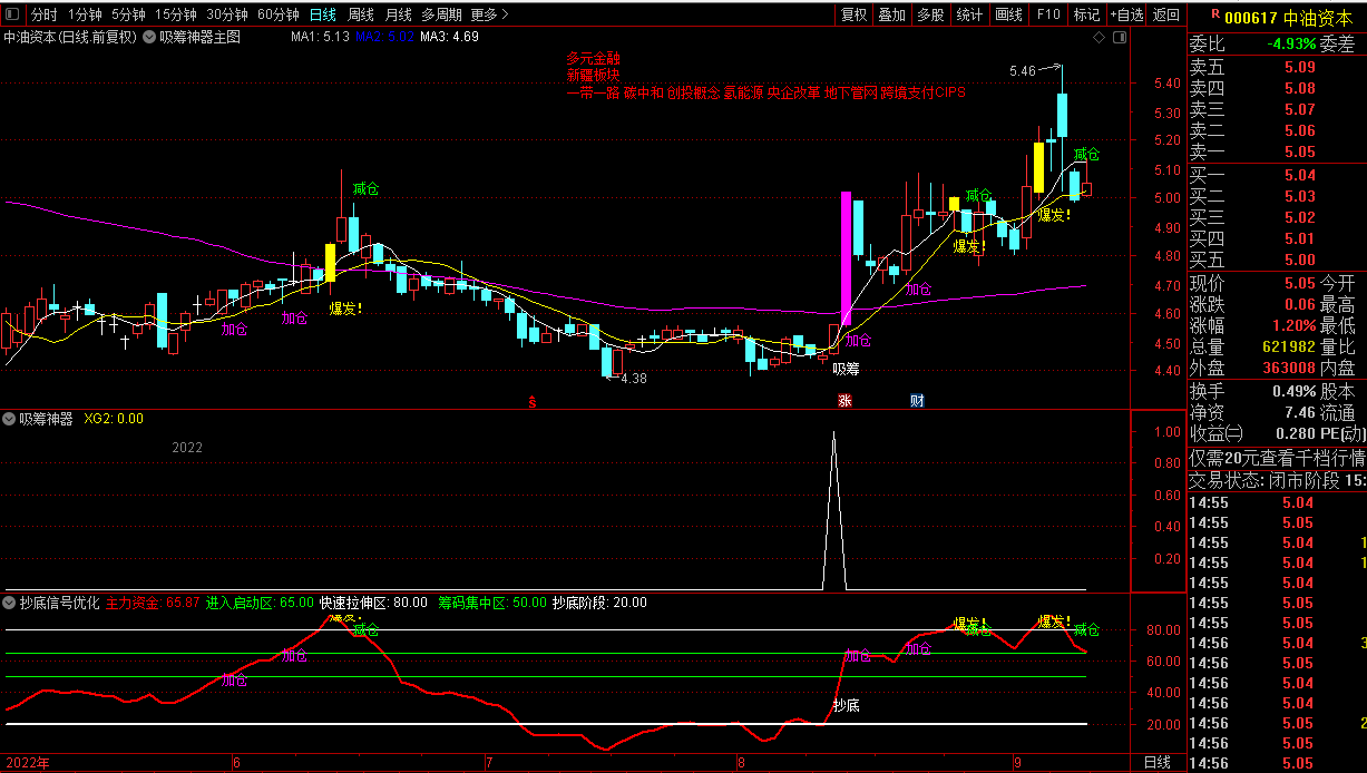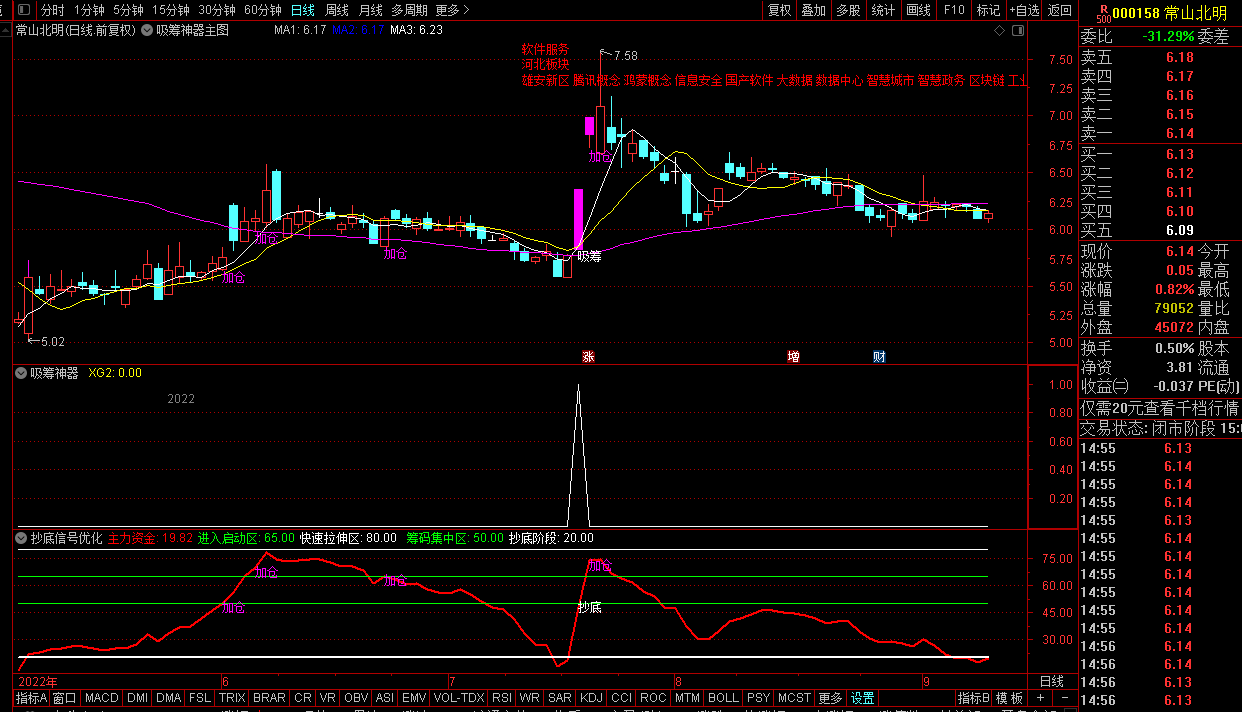 该指标主图包含加减仓信号,和抄底信号,信号和副图同步对应。副图除了包含操盘信号外,还有当前股价所处位置的高低,有主力资金线,抄底区域,启动区域,快速拉升区域,信号简单易懂。信号参考还是当天尾盘14点50开始选股,适合于尾盘参与。